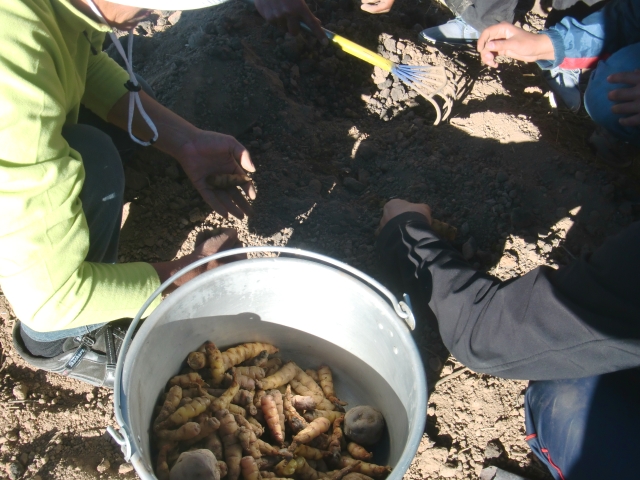 ペルーの焼き芋、ワティア体験レポート Pomata 13、ペルー 2018年08月09日 ここ数週間ずっと風邪でダウンしていたのですが、ひたすら寝ては起きるをくりかえす自分に対し、ホテルを経営する家族の人たちは「太陽にあたって少し運動したほうがいい」と思ったらしく、ポマタ村まで日帰りのお出かけに誘ってくれました。おいしい芋をご馳走してくれるということで、ここのところ1食しか食べてなかった体をいたわるため、行ってみることに。今回はそれを簡単めにレポートしたいと思います。朝起こされ、ホテルの家族のなかでは姉にあたる人と一緒に外へと出ました。鼻水が止まらないため、ポケットにはトイレットペーパーを準備。コンビと呼ばれる小さなバスを乗り継いでポマタ村へ逆戻りします。そこには彼女の別の兄弟がすんでいるという話でした。 ↑芋で遊ぶネコに別れを告げて出発村のはずれにあるガラス張りの家へ向かうと、小柄な女性が迎えてくれました。 ↑こんな家 ↑中からはこんな風風邪を引いていることに気づくとのど飴をどっさりくれ、家の屋上からの景色を見せてくれたりとホスピタリティ満載。畑には、石が積まれた小さなかまどのようなものが。ワティアというこれを使って芋を蒸すのだそうです。 火起こしに手間取っている間、今度は兄がこちらへ来てカヤックに誘ってくれました。「風邪がひどくなるかもしれないからどうかなぁ」という兄でしたが、せっかくだから行ってみることにしました。チチカカ湖の小さな埠頭のようなところで息子が2人いて、カヤックを2艘泊めてありました。 さっそく乗ってみることに。 ↑脚を入れる空間があるこれがもうかなり難しく、ちょっと動いただけでカヤックは横に倒れようとします。この日は風が強く、波で勝手に沖へと流されると、戻れなくなるんじゃないかと恐怖心をあおられました。方向転換のためパドルを水面に落そうとしたならば、バランスはそちらへと傾き、これまた転覆の危機。八方ふさがりです。つんでる。たすけて。 ↑波にさらわれている様子 ↑兄は遠くまで行ってしまったそんな状態だったのですが、すぐにパドルの扱い方やバランスのとり方がわかり楽しくなってきました。こんなに短時間にできるようになるなんて、あれ、これ天才なんじゃないの?もうちょっと楽しみたかったのですが、寒いのでそのまま戻って終了。「もう一度乗るかい?」と聞いてくれる息子たち。乗りたいのは山々ですが、咳が出てきていたので断ってしまいました。 ↑カヤックを引き上げてくれる息子たち ↑カヤックで楽しむ息子たち ↑このあたりのチチカカ湖も結構きれいである ↑途中、羊飼いが羊に水をあたえるためにやってきた今回はあまり体験できませんでしたが、きっとまたどこかで乗ってみたいと思わせられるいい経験となりました。途中からカヤック乗りに参加していた小柄な女性とともにガラス張りの家へと戻ります。すでにかまどには火がつけられ、その上から土がかけられていました。 新たな男性が2人。これまた別の兄弟と、小柄な女性の夫だそうです。その兄弟は昔5年ほど日本で自動車関連の仕事に従事していたらしく、すこしだけ日本語を話すことができました。しかし間違えるのが恥ずかしいらしく、もう忘れてしまったと言ってあまり話してはくれませんでした。みんなで会話しながら芋がふかされるのを待ち、時間が来ると一斉にワティアのところに集まりました。土と石を掘りながら芋を探して取り出し、ときどきつまんでいます。少しもらって食べたところ、砂でじゃりじゃりしていますが、なるほどおいしいです。ミネラル豊富。つい先ほど聞いた「この辺の人たちはワティアが好きなのだ」との話通り、みんな楽しそうに芋ほりを進める一行。 ↑ネジネジしているのは「オカ」と呼ばれる甘い芋鍋一杯になった芋にちょっぴりスパイシーなソースをつけて、地元産のチーズやステーキと一緒に食べます。やっぱり土だらけだけど、うん、たしかにおいしい。 食べ終わったころには日もしずんで少し肌寒くなってきました。風邪がひどくなったのか具合が悪くなり、一人家のソファーで寝る自分。 ↑その間男性陣はロッククライミングの降りる版をやっていた。高いところが苦手な自分はどちらにしろ参加してなかった目が覚めると、いつの間にか全員パンとコーヒーという軽い夕食をとっています。どんだけ食べるんだ! と思いながらコーヒーをいただき、みんなで写真を撮ってバスで帰りました。翌日、風邪がひどくなり一日中寝ていましたが、そのまた次の日にはかなり良くなっていました。ワティアのおかげでしょうか。それとも風邪をみんなにうつしたおかげなのでしょうか。……いや本当にうつったかどうかはわかりませんが、改善してきたようでよかったです。今度はちゃんと元気なときに、またカヤックに挑戦したいと思います。いつか。どこかで。 [2回] http://yumenosukoshiato.ichi-matsu.net/per%