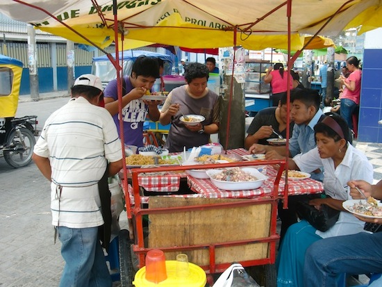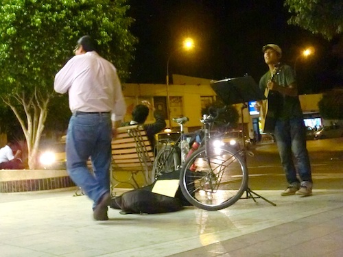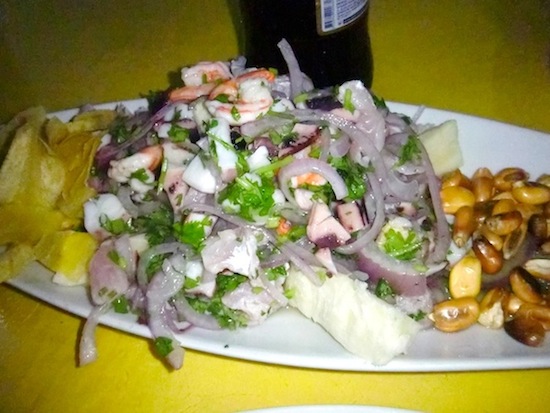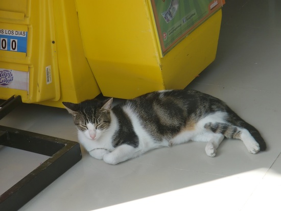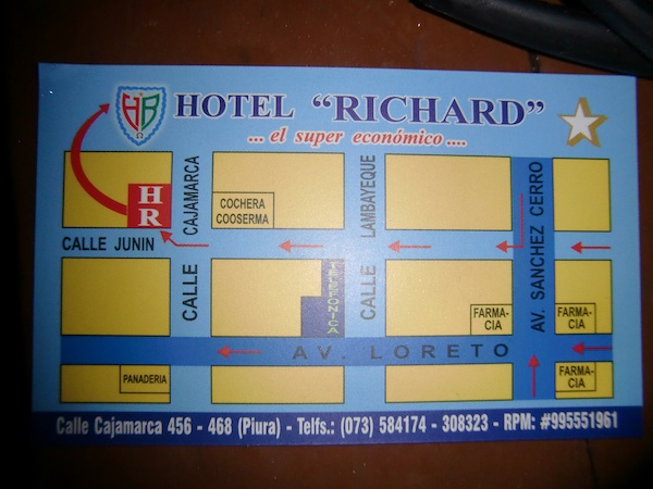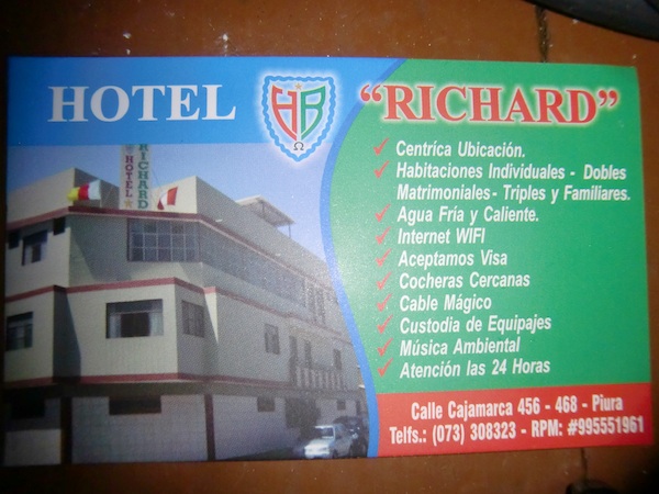 ペルー初の大きな町 Piura を歩き回る話 13、ペルー 2015年12月22日 さっそくだがピウラに来た人のために、ここで泊まっていたホテルはこちら。 リチャードホテル。 まっすぐピウラに入ってきた場合に通る"サンチェスセロ通り"から2本中に入ったところにあるのでちょっとわかりにくいが、一応看板がその通りからでも見えるはずだ。 部屋ごとに料金が細かく別れていて、一番安い25ソル(約875円)はバストイレ別。 部屋の広さは狭くもなく広くもなく、棚とテーブルがついているのでわりと便利だった。 自転車は1階に置かせてもらえたので部屋も広くつかうことができた。 窓には金網がついているので開けられるが扇風機はなし。 窓を開け放しでもなぜか蚊は入ってこなかった。 wi-fiが強力なのか、3階のこの部屋の中からでもネット回線はものすごく軽い。 この環境を逃すのはもったいないと、youtubeの動画を急いで作り上げてアップした。 ここのオーナーもムッとした顔のわりに結構いい人で、道端で会ったときには彼が手に持っていたビールをごちそうしてくれたりもした。 荷物を置いて少し町を探索。 ※ここから写真が多くなりますが、ご了承ください。 町の中心をはしる主要道路はかなりの賑わいを見せていた。 屋台で昼食をとる。 タレを混ぜ込んだベチャッとしたチャーハンのようなものに刻んだタコと白身魚入りマリネのようなものをのせる。 このマリネが「セビーチェ」と呼ばれるこの辺の名物料理のひとつだということを後日知った。 コップで出てきたコスタリカのセビーチェとは違い、作りが粗い。 魚の身に骨がついていることもままある。 そんなでも、暑いこの土地で食べる酸っぱい料理はとてもおいしく感じられた。 隣の屋台でジュースを飲む。 手前の紫のものがchicha morada(チチャモラーダ)という甘いトウモロコシジュースで、右奥のコーラのような色のものがsebada(セバーダ)というらしい。 セバーダはなんともいえない独特な味がする。 言葉でうまく表現できないが、常温で放置しておいた何かの漬け置きジュースのような、ちょっと悪くなってるような味だ。 おそらく嫌いになる人も多いのではないだろうか。 こちらに詳しい情報が載っていたのでここに貼付けておく。 チチャモラーダ:http://nandiperu.com/blog/comida/チチャモラーダ%E3%80%80ペルーの国民的ジュース/ セバーダ :http://www.mucha-suerte.com/comida/cebada.html へえ、セバーダは大麦が使われていたのか。 ちなみに現在2015年のこれらの値段は1ソル。 もう少し奥へ行くと、大きなメルカド(マーケット)が広がっている。 ものすごい人の量だ。 大通りにも商品や屋台が並んでいて、かなり広い範囲に店が構えられている。 普段のメルカドというのは、天井に布やシートが張りめぐらされているかトタン屋根の下でひらかれていて薄暗く、ちょっと小汚いイメージだった。 ここでは太陽のもと、明るいメルカドが広がっていた。 フルーツのいいにおいを嗅ぎながらまだ奥へ進んでみると、モールを発見。 なんとスターバックスがあった。 スタバなんてコロンビアのボゴタ以来だ。 かなり景気のいい町なのかもしれない。 ここはかなり高級な店が並んでいて、自分には縁のなさそうなところだ。 来た道を戻ると橋がある。 川が流れていたであろうそこは、今はカラッカラに渇いてしまっていた。 橋の上でオカリナを吹いて何度かバスキングしてみるも、1日に一食分程度しか稼げなかった。 街中にポツンとあるポストっぽいなにか。 今調べてみたところ、buzonというのがメールボックスのことらしい。 本当にポストだったのか。 ペルーにもポストがあるなんて思わなかった。 もしこのときにわかってたら、ためしに日本に絵はがきを送ってみたのだが、時すでに遅し。 現在これを書いている町はピウラから100km以上離れてしまっている。 実はここで、エクアドルのクエンカで会ったチャリダーの佐々木さんと再会した。 ここは儲かるらしく、長期滞在しているのだとか。 佐々木さんが歌い始めると、 どんどんチップが入り、 こんなに集まることも。 一緒にバーへ行ったり買い物をしたりちょっと散策したり、数日に渡りお世話になってしまった。 これは佐々木さんがバーで頼んだセビーチェ。 こんもり盛られている。 このセビーチェを分けてもらったのだが、この中の紫のとうがらしがものすごく辛く、辛いのが苦手な自分はあまり食べられなかったのが残念だった。 この町は広場や公園が大きな通りから少しはずれたところにある。 ↑グラフィティと書かれているので、落書き歓迎ってことだろうか。心が広い ↑公園内にはコンクリート製のチェス盤がある ↑オレンジの鳥 ↑これは別の公園だが、リスが走り回っていた。ここは蚊が多すぎてすぐに退散する この町はネコも非常によく見られる。 いたるところにいるネコたち。 前回も話したおいしいジュースのアクアリウス。 フルーツの味が濃くてサラッとさわやか。 フレーバーが4種類くら