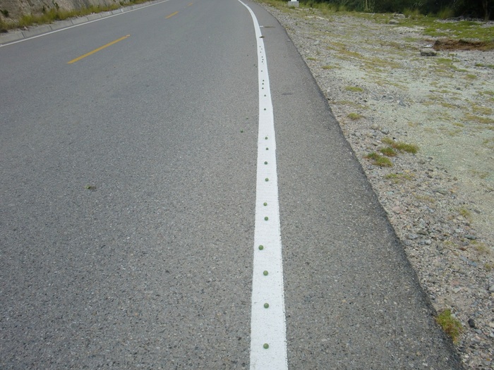 標高マックス!エメラルドグリーンの岩壁 Llama - huambos 13、ペルー 2016年02月05日 ドラえもんの道具で今使いたいものbest33位、リフトストック(傾けて坂にするステッキ)2位、4次元ポケットそして栄光の第1位は、 タイム風呂敷というのも、とにかく身の回りのものが壊れる壊れる。次々に使えなくなっていく。ほんと、タイム風呂敷ほしい。さっとかぶせて修理や売ってる店を探す手間をなくしたいし、壊れる心配とかなくしたいし、なんならいっそ自分にかぶせて若返りたい。問題はパソコンやメモ帳などの記録物には使えないというところですよね。パソコンに使ってしまったら中に入っているデータも戻って消えてしまうので、それはかなりマズい。バージョンが戻るのは更新やアップデートでなんとかなるとしても、写真なんかはバックアップ取ってないとどうやっても戻りませんからね。ところでタイム風呂敷で時間を戻すとその後同じ時間経ったときにデータが増えていったり同じ傷ができたりということはないんですよね?ということは時間を戻したあとは別次元を歩むことになるんだ…そう考えると、ちょっと怖いですね。でも欲しい!だってもうすぐザックの肩ベルトが切れそうなんだもの。自転車もボロボロ。カメラもなんか中からカタカタ聞こえる。今日もザックカバーがバチンと大きな音を立ててゴムが外れまして、使用不可能になりました。とりあえず気持ち程度にザックの上にパサッとかぶせておいて雨にも負けず風にも負けず、頑張ってもらっていました。休憩中に直したのですが、外れたところを固定しようとライターで炙ったのがいけなかった。紐が裂けて余計にちぎれやすくなってしまったのです。この日は頭を思いっきり、具合が悪くなるほどぶつけたり、本当に不運な日でした。幸運なことと言ったら、今日が晴れたということ。晴れたといっても雲の量は多いのだけど、現在雨期のこの地で真っ青に晴れることは少ないと思うので、霧がない=晴れのようなものだろう、きっと。一応太陽も顔を出しているし。 ↑ホテルから。昨日までこの山すら見えていなかった ↑看板通り、Chota(チョタ)を目指しますおかげで今まで見ることができなかった風景をおがめることができて、それは本当に幸運だった。 ↑こんな風景になっていただなんて、歩いているときは思いもしなかった ↑山の連なりがきれい ↑ジャマ。こう見るとそんなに大きくないな ↑今まで歩いてきた道が見える。美しい森がひろがっている ↑次の町、Cochabamba(コチャバンバ)まで58kmこの先またまたのぼりが待っている。どんどんと標高を上がっているのが、崖から見えている世界の広がり方でわかる。 少しずつ 少しずーつ 高くなっているのがわかるでしょうか。 ↑紫の土壁がサラサラと崩れ落ちていく。粒子が細かく脆いらしい。岩がないので落石の危険はなさそうだ休憩しながら進んでいく。こちら↓は立ち休憩のポーズ。ザックをサドルに乗せて立ったまま休む。 ↑こう見るとカッコわるいね注意点は、後ろの荷台にザックを載せると荷台が折れてしまうのできちんとサドルに載せること。自転車をこぐときも荷台に載せてはならない。肩で支えなくてはいけない。荷物を降ろしたり背負ったりするときにかなり体力を使うのと、ザックに負担がかかってしまうので、ちょっとだけ休憩したいときはこの立ち休憩をつかう。休憩がてらに写真も撮る。 ↑誰かが並べたのだろうか。ポトポト落としたにしてはきれいに並びすぎている ↑親子の犬。仲がよさそうかなり高い所まで来た。町はまだだろうか。後ろから雲がジワジワと迫ってきている。さっきからパラパラと雨が降ったり止んだりしているが、あの雲が来てしまったら本降りになってしまうかもしれない。この峠をこえれば雲がひっかかってこちらに来るのに時間がかかるだろうと予想する。雲との追いかけっこが開始。体力的にも限界が来てしまい、民家のベンチで休ませてもらっているとき、ついに霧があたりを包んだ。気温が一気に下がる。汗が冷えて寒いところを耐え、霧がうすくなった瞬間を狙って自転車をこぎだした。ここからちょうど下り道になる。これはナイス。一気に進んで雨を追い越そう。と思ったら、ブレーキが利かないのを忘れていた。全然ナイスじゃない。先の見えるところや急すぎないところだけ運転し、あとは自転車を押しながら自制していくことになった。これ、自転車の意味ある?下りはずっと続いていく。その途中でトルコ石のようなエメラルドグリーン色をした岩場を発見する。その色合いは芸術だ。 それまで大きな植物があまり生えていなかったのだが、このあたりだけ緑があふれ低地の草原のようになっている。この青い石が関係しているのだろうか。もしかしたら栄養価が高いのかもしれない。 ↑この一角だけフッサフサ!行けると思った坂が実はけっこう急だったりして足裏でのブレーキを駆使しつつ、ヒヤヒヤしながらやっ