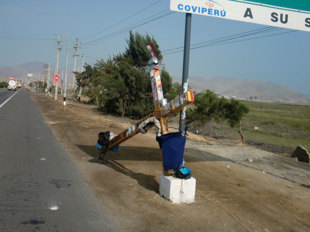 マラだけど、マラじゃなかった Mala 13、ペルー 2016年08月20日 サンバルトロのホテルを出て出発。ハイウェイがすぐ近くなのでスムーズに町を出ることができる。少し走っていると、地面に書かれた絵が見えた。ナスカの地上絵かな? ↑よく描かれているそんな冗談を心のなかでつぶやきつつ写真を撮りながら走っていると、今度はアイス屋さんがズラッと並ぶ通りへ。せっかくなので、ひとつください。 このアイス屋、どこもなぜか宇宙人やよくわからないキャラクターが書かれている。 ↑緑やブルーの両腕をつかまれてそうなものからブラウニーのような妖精風のものまで豊富に取り揃えておりますよくUFOが来るのだろうか。それとも、ご当地のゆるキャラ?アイスを食べてみる。マズくはないが、値段が高い割にそれほどおいしいとも思えない。お値段未満。うーん、ハズレだったか。ああ・・・ 地元の「走るアイスクリームショップ」のアイスや「ミルク通り」のソフトクリームや「ジジ」のジェラートが食べたくなってきた。生まれ育ちが北海道なので、牧場が豊富な関係上、実家の近くにはたくさんのアイスクリーム屋があり、そういう意味では夏はパラダイスなのだ。あーあ、最高においしいアイスが食べたい。その先すぐにこんなものが。 十字架!?だれかがかついで来た、ってことだよね、これ・・・・・近づいて詳しく見てみよう。なるほど、快適にかついで運べるよう色々と工夫がしてあるようだ。十字架の底にはキャスターがつけられており、転がしていくことができる。十字架の脇の片方、肩に当たる部分にはクッションが巻き付けられ、十字の端っこにそれぞれ荷物がつけられるようになっている。見えにくいがキャスターの上には寝袋などがくっついていた。前後輪の上に乗せる自転車の荷物配置とよく似ている。十字架本体にはいろいろな人の顔写真がはっつけられていた。これを運んで巡業しているなんてすごいな。キリストを彷彿とさせる。少し前までここにいた形跡があったが、残念ながらこのときはちょうど席を外していたようだ。写真だけ撮らせてもらって、すぐ前進。 ↑Leon Dormido眠れる獅子とはカッコいい名前だなぁ ↑ここが「眠れる獅子」村らしい。たしかに静かだった ↑このほら穴がいいね ↑砂漠のなかのオアシス的な景色もあったこの日はいろいろな景色を見ながら、Mala(マラ)という町に着いた。malaとは、スペイン語で「悪い」という意味だ。ちょっと怖い。ホテルを探してみるが、どこも閉まっているか、めちゃくちゃ高い。やっぱりか。この辺の海沿いはどこも海水浴に来る人狙いで、値段がとても高くなっているようだ。なんてところだ。マラだわ。これはマラ。途方に暮れていると、一人の土木作業員風の男性が親切にも一軒のホテルへと案内してくれた。連れられたそこは、ホテルというか、食堂だった。そこで30分ほど待っていると、おかみさんが帰ってきた。「ドミトリーならなんとか用意できるよ」ということで、そこで一泊お願いした。ベッドを開けてもらう。ここは土木作業員たちの下宿のようになっていたようだ。室内はジメジメしていてカビのようなにおいがする。ルームメイトはこちらを快く迎え入れてくれた。ちなみに値段は5ソル(175円)。今まで泊まったホテルのなかで一番安い。最安値更新しました! ↑hospedajeと書かれていたのでここに泊まるのかと思っていたら・・・ ↑この食堂の奥に泊まることになった仕事を終えた男たちは、ひとつしかない食堂のシャワールームを取り合い、そのあとは夕食まで食堂内でかかっている海賊DVDの映画を見たり、隣のグラウンドでサッカーを見たり、外へ友人と会いに行ったり。そんなペルーで働く人々の生活を垣間見る。冗談を言ってからかい合いながらすごす彼らのその時間はとても穏やかでやさしく、セピア色をしていた。この食堂も夕食セットが5ソル(175円)と、安く食べることができた。なんだ、いいところじゃん。全然マラじゃなかった! [1回] http://yumenosukoshiato.ichi-matsu.net/per%C3%BA/malatownマラだけど、マラじゃなかった Mala