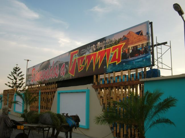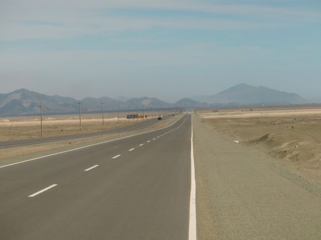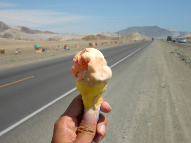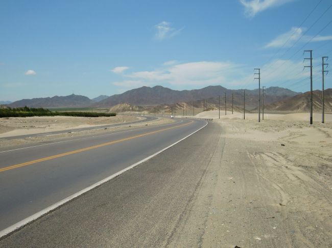 町の起源になる場所 Chimbote 13、ペルー 2016年05月22日 2016/3/7 Perú, Chao チャオ先は走りやすく、歌なぞのんきに歌いながら気持ちよく走る。久しぶりに快調だ。遠くに見える山の面に砂がかかって、まるで大きな砂丘のように見える。向かいで荷物を満載にした自転車乗りが走っている。珍しい。相手もそう思ったのか、こちらを2度見していた。手を振って挨拶。休憩中に食べようとしたチョコペーストが溶けていて、手にべたべたついて大変だった。中米ほどではないにしても、やっぱり暑い。 ↑なんにもないね。でもこういうところを走るのは好き ↑砂の中に金色のつぶつぶが混じっている。太陽でキラキラ光っていてきれい気が付かないうちにのぼり坂になっていて、気が付かないうちにバテていた。そんな中、向かいから今度はバイクが走ってくる。見るからに旅行者という出で立ちの彼は、こちらを見るなりUターンして戻ってきてくれた。エクアドルに住んでいる彼は、ペルーのリマで日曜日に行われていたローリングストーンズのライブを見に行ってきたらしい。日曜日といえば、トルヒージョを出てきた2日前。どおりで昨日、テレビのニュース番組でさんざんI can get no satisfaction!を連呼していたわけだ。 ↑GoProでこちらを撮影するライダー彼は常時ハイテンションで話し、その調子で去っていった。通りがかる車の人たちもみんなクラクションを鳴らしてくれたり、親指を向けてくれたり、手を振ってくれたりする。それほどこの道はライダーやチャリダーが多いということか。さっきも自転車の人とすれ違ったのを思い出す。しばらく何もない砂漠を走ると、野外フェスのような場所に出くわす。道のわきにワラで作った小屋が、遠くまでずらっと並んでいた。何かわからないが、キャンプ地のようなものなのか。小屋の素材になるだろう細い丸太やワラを積んでいる軽トラが多い。このように人がいっぱいいる場所だと、食べ物や飲み物を売り出す人も現れるのが世の中の常。それまで無人の砂漠だったので、喉が渇いてしょうがない。ジュースを売っているところで一つ頼むと、その売り子さんに「あなたもここに住むの?」と聞かれた。どういうことか聞いてみる。みんな各地からこの場所にきて、勝手に自分の家を建てているのだとか。一時的な野営ではなく、居住区だった。もしかしたら、これは町が出来上がるまでの最初の景色なのかもしれない。これから数年後に家が建ち始めたら、ここはなんという名前になるのだろうか。 ↑簡素な家がひしめき合っている ↑砂漠の真ん中でアイス。なんて贅沢なのだろうその野営地で一泊しようか迷ったが、今日は次の大きな町まで行きたかったので、そのまま通り抜ける。そこからが大変だった。まっすぐに伸びた長い長い道路があった。とにかく長い。どこまで行っても先が見えない。奥は蜃気楼でゆがんで見える。ひら地ではあるのだが、これが本当につらかった。 どんなに走っても、その努力が報われないような無力感におそわれる。本当に進めているのだろうか。いつもはカーブが多いと文句を言うのだが、先が見えすぎるのもよくないのだとわかった。向かい風が強く、スピードが思うように乗らない。これまで結構な距離を走ってきたので、脚にかなり負担がかかっている。腹も減った。疲れた・・・・・こんな何もないところで一泊するのは危険ではないか。テントも丸見えだし、夜は危ない気がする。砂漠の真っただ中で疲れ切り、正直不安しかなかった。やっぱりさっきの野営地に泊まればよかったんだ。しかし今からそこまで戻るにも2時間はかかる。「もうダメだ、危険でもここで野宿しよう」そう思った。遠くに点のような看板が見えた。とりあえずそこまで行けば、少しくらいはカモフラージュになるだろうか。自転車も地面に倒して置いておきたくないし、あそこまで頑張ろう。近づいてみると、その看板はリゾート施設のもので「もうすぐそこですよ」という内容だった。これは救われた。もう腹が減ったし喉も焼けつくようだ。 ↑リゾート施設。プールや遊具があり、池にはガチョウの群れが飼われていた中のレストランはさっき終わってしまったらしい。スタッフたちが軽トラに乗りちょうど帰るところだった。なんとか引き止めることに成功。ギリギリセーフ。しかしここは観光地。料理の値段はほかに比べ、4倍はしている。あきらめてそこを去ろうとした時、「ちょっと待ってて。ご馳走してあげる」と言われ、お菓子と弁当を持ってきてくれた。しかもタダで。本当に腹が減ってしょうがなかったので、とてもうれしかった。弁当はそんなにおいしくなかったが、そんなことはどうでもいい。彼らの気遣いがとてもうれしかった。まさにバクバクという感じで夢中で弁当を食べていると、プールの監視員風の若い男性がこちらへきて、今日はここでキャンプしたらいいと言ってくれる。泊まるところも手に入れることができた。