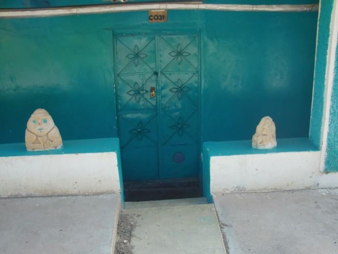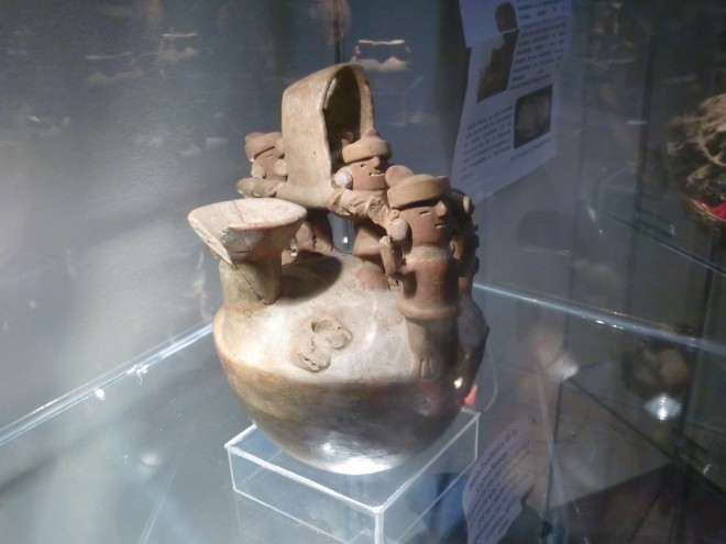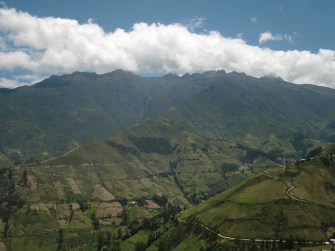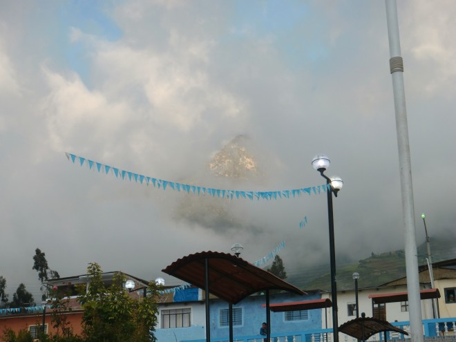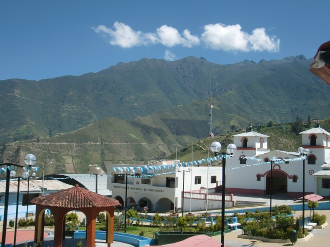 助けてくれた人に再会する Pamparomás 13、ペルー 2016年05月27日 2016/3/16 Pamparomás, Perú昨日まで山を登ってきたため、体中が筋肉痛で痛い。例のバイクカップルの家を探す。名前以外まったくヒントがないので、とりあえずブラブラして見つけた大工たちに聞いてみることに。おっかない顔の男性が前に出てきてこう言った。「それは俺の息子だ」と。えええー! まさかのドンピシャ。そうしてバイクの人の家まで連れて行ってくれた。家に入れてもらう。彼は今、療養中らしい。昨日食中毒になったらしく、注射を受けたら今度は体が動かなくなってしまったらしい。彼女のほうは別の町へ働きに出ているという。しばらく2人で話をする。彼はこのあたりの植物や虫の研究をしている研究家なのだそうだ。これからの詳しい地図を見ておきたかったので、この町にネット屋はあるか聞いてみる。ネット屋はないが、しかし市役所で貸してくれるから連れていってあげるよと言ってくれた。肩を貸して、急激な坂のうえに建てられた町なかをゆっくりゆっくり進む。案内された市役所の人たちもいい人で、パソコンの地図を見ながらこれからの道の情報を教えてくれる。そのうえ、役所内に保管されている発掘物まで見せてくれた。 ↑博物室の展示物 ↑かわいい夕食にも招待してくれた。お父さんと一緒に、パンとタマル※1という料理を1/3。昨日の村もそうだったが、このへんはどこもこのような質素な食事をとっているのだろうか。それにしてはバイクの彼はかなり太っている。それはなぜか聞いてみる※2と、朝と夜は軽く食べ、昼にがっつりとるのだそうだ。ちなみに、訪れたときには昼食も誘われたのだが、すでに食べてしまったので断った。だから昼がどんな料理だったのかはわからない。※1 タマル(tamal) ... メキシコと中南米でよく食べられる、ちまきのような料理。トウモロコシを練って中に鶏肉などをはさみ、それを葉っぱにくるんで蒸す。※2 失礼である。相手は笑っていた。ホテルに帰って、もらった情報を整理しながらこれからの緻密な予定を立てていく。標高、傾斜、自分の足のスピードを考えると1日に進める距離はこのくらい。寒いので水は少なくても大丈夫だが、食料はどうするか。明日はここで泊まって次の日はここまで行って・・・・・いつもはこんなタクティカルに考えず気分で進行を決めるのだが、人が少ない山の上ともなるとどうしても心配になり、先のことを考えてしまう。どうせ予定通りにはいきっこないのにね。村の人たちが、この先は寒さも厳しく村も少なくて危険だという話をひっきりなしにしていたのも気になっていた。 ↑村の広場。山と両方見渡せる2016/3/17朝食をすませ、11時すぎにホテルを出て出発。空は晴れ。気圧のせいか寝起きがよかった。しかし山の頭に雲がかかっているのが気にかかる。数時間で天気が崩れてくる可能性があるので、すこし急ぎ目で進もう。 ↑雲がかかり始めている ↑民族衣装を着た少女たちが山道をゆく途中、霧の中に入ったが、太陽の力は封じられずに強く肌に感じる。おかげで寒くはない。景色を楽しみながら、坂を一歩一歩のぼっていった。 ↑霧がかかってきたところ目指していた村は、いつの間にか通りすぎていたようだ。すれ違うおじさんが、この先歩いて2時間のところから来たと言っていたので、そこを目指すことにしよう。 携帯片手に崖の上に立っているおじいさんに、「うちに泊まっていけ」と言われる。それはありがたいのだが、そのおじいさんは電話を待っているためそこを離れられないという。スペイン語をろくにできない自分には、彼がいないとどうすることもできず、どこが彼の家なのかさえわからない。とにかくこの先に村があるらしいので、行ってみることにした。細かく分かれた村が5つほど、崖のむこうとこちら側で丸く電車のようにつながっている。 ↑崖の下と奥に3つ村があるよという意味の看板ここにはレストランはないが、商店ならいくつかあった。その一軒に入ってみる。そこでは宿泊もやっているという話を聞き、これ幸いとお願いした。しかし、部屋の鍵が見つからないらしく、小屋を紹介されて「ここでテントを張ってくれ」と言われた。天井には牛の毛皮がぶら下がっている。広いが何もない。トイレもシャワーもない。お値段10ソル。キャンプなら別の場所で無料でできる。断ってしまった。 ↑外見はターコイズブルーで埴輪のような像があってかわいらしい宿、というか倉庫さっき目星をつけていた、キャンプによさそうな場所へ戻る。教会と学校がくっついたようなところで、トイレも水道もある。最高だ。村の人に聞いてみると、ここでキャンプOKとのこと。標高が高く夜はかなり寒いが、普段なら暑すぎる羽毛の寝袋を使っているので、凍えることはなかった。前に使ったときに急いで片づけたので、足元がすこしばかり湿っているのが気になる。 ↑畑の奥に雲海 ↑夕日ハンディラジオでこ