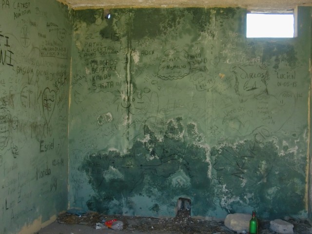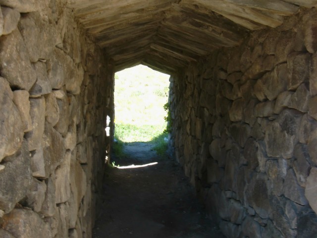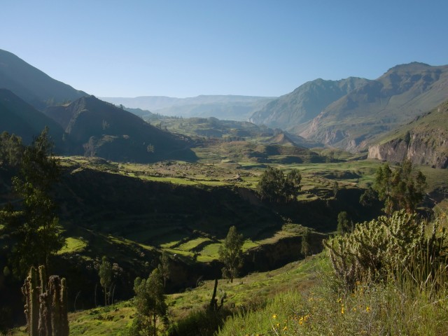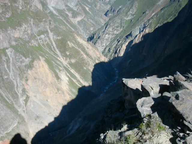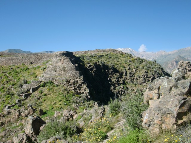 コンドルが見えるかもしれない要塞 Fortaleza Chimpa 攻略編 13、ペルー 2017年04月25日 前回の投稿にて攻略に失敗したMadrigal(マドリガル)にあるFortaleza Chimpa(フォルタレサチンパ)ですが、馴染みのカフェでそのことを愚痴っていたところ、昔行ったことがあるというオーナーのフレディさんがバイクで入口まで連れて行ってくれるという話になりました。でね、また行ってきましたよ。結果を先に言うと、ちゃんと登頂できたんですけど、今回もこれまた悔しい結果に終わってしまいました。行かなきゃよかったんじゃないかってくらいにもうホント。なにがそんなに悔しかったのか。ちょっと長くなりますが、まあ聞いてやってください。 ↑クリックで少し拡大可。コンパスの左上に現在地Chivay(チバイ)、中央あたりにマドリガル、そのちょい左に見える黒いコンドルの絵のところがCruz del condor(クルースデルコンドル、コンドルの谷)朝5時に待ち合わせ。外は非常に寒く、しかもバイク移動なので頭に首に手にと着こまなくてはなりません。エンジンを温めて出発。外は暗いながらも、顔を横に向けるとはっきりとした山の輪郭や谷の影が流れていきます。空は次第に明るくなり、山の向こうから一本の太陽光線が、ミルク色・紫・オレンジ・薄い水色に濃い空色とグラデーションを作りながら天上へ向かって射しています。・・・実を言うと、これが一番きれいでしたし、楽しかったです。このバイク移動のときが。マドリガルに到着したころには2人とも凍えてしまっていました。とくに膝が冷たくなって、脚がガクガクと大きく震えます。まだ6時30分で食事ができなかったので、コーヒーだけ注文。ホテルからもらってきたパン一つを半分、運転手フレディさんに分けてあげました。コーヒーはフレディさんがおごってくれ、それからもう一度バイクにまたがりフォルタレサの入口へと進み出ます。前回とは全く違う道へ・・・・・下に地図を用意しました。赤い線が前に行った道。ここからでも行けはしますが、かなり険しい道だったようです。前に写真を載せた川のなかを渡るか、崖の上から降りてこないといけないという意味なく危険が伴う道でした。今回は広場の横を通り、途中軽い十字路っぽいところを右方面へ抜けて砂利道をずっとずっと進む道。川があるところまでバイクで送ってくれたフレディさんとはここでお別れ。ちょうど同じタイミングで他の観光客3人も車でやってきました。うわ。マジか。自分一人しかいないと思ってたのに。このあたりでテンションは下がり始めています。 ↑川のところにある看板が目印空はだいぶ明るくなってきていますが、それでも寒い。どのくらい寒いかというと、 ↑朝露が凍ってしまうくらい寒いのです!2つ目の川の場所。上の手書き地図参照。 休む場所があったり駐車場があったり。ここでキャンプもできそうです。 こんな細い橋を渡ったら、ここから登山が始まります。 ↑寒いのにサボテンだらけ。影になってますが右下にもウチワサボテンがあります高所なのでちょっと登るだけで息が切れます。動画用にしゃべりながらカメラを向けて歩いていたので、さらに苦しいです。 ↑15分くらい登るとこんな景色椅子やゴミ箱など休憩場所が各所たくさん設置されている模様。 道が時々わかれていますが、毎度看板が設置されています。これで迷わないね!(下にも付けておけよ!) 遺跡のようなものも。 かまどとツボが置かれています。 昔の人がここに住んでいたのでしょうか。説明などはありませんでした。柵もないので、いつか誰かに壊されそう・・・そろそろ太陽が昇ってきて暑くなってきました。ここは非常に光が強いです。日焼け止めクリームとサングラスを持ってきた方がよかったと後悔しましたが、時すでに遅し。まあ天気がよくてよかったということにしておきましょう。汗をかくと体が冷えて大変なので、防寒のために着ていたレインジャケットなどを脱いで体温調整します。なにかちょっとカッコいい岩の隙間を発見。 道を外れて近づいてみます。 そこからの眺めは、 おおー。晴れているおかげでよりきれいに見えますね。まだ太陽が昇り切っていないので、影ができてまだはっきりとは写らないです。そうして写真や動画を撮りながら登り始めて約2時間、ようやく頂上へ。 ↑眩しすぎるせいで少し白っぽくなってしまってます何やら城壁のようなものがあります。まったく事前情報なしで来たのですが、フォルタレサというのは「要塞」という意味だそうです。今調べました。攻めてきたスペイン人が建てたものでしょうか。 1年ほど前に大きな地震があってこの辺は通行止めになっていたと聞きましたが、それでも崩れずに残っているというのはすごいことです。だってこれ、石積んだだけでしょ? 向こう側にある見晴らし場へ行くため、中をくぐります。すると、すごく小さな狭い階段がありました。 わーすごーい、RPGみたーい。気になるのでちょっと上
