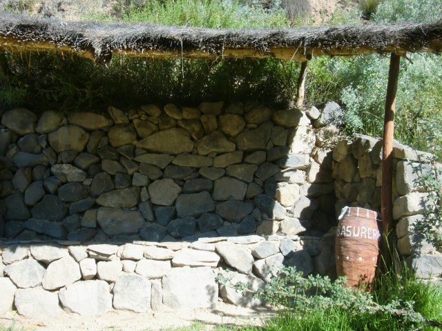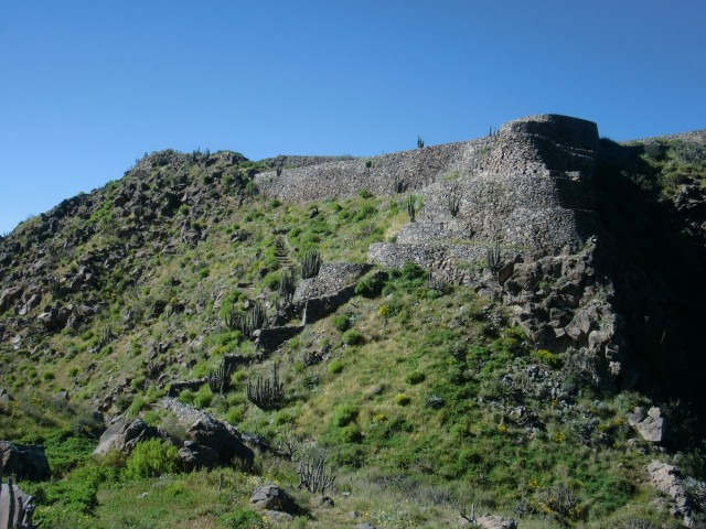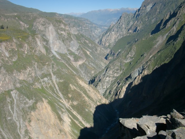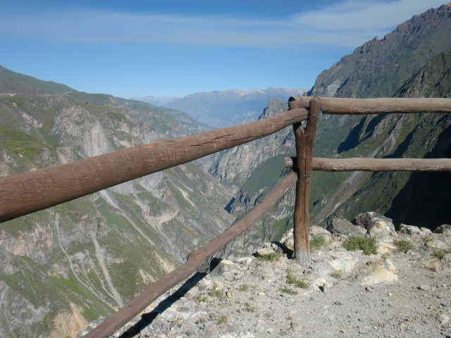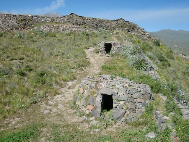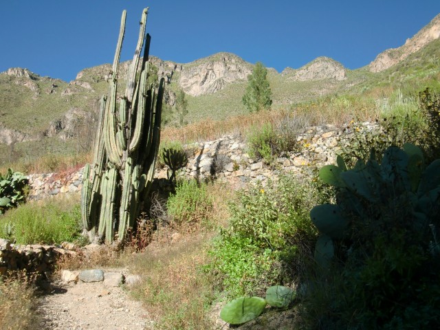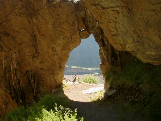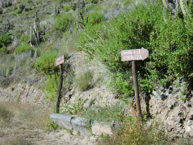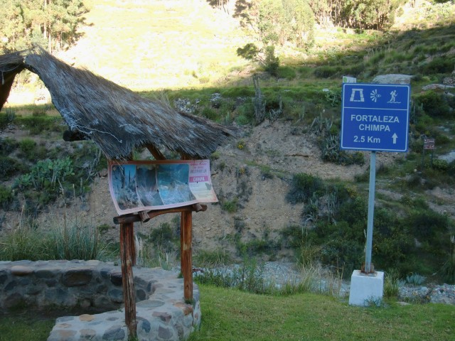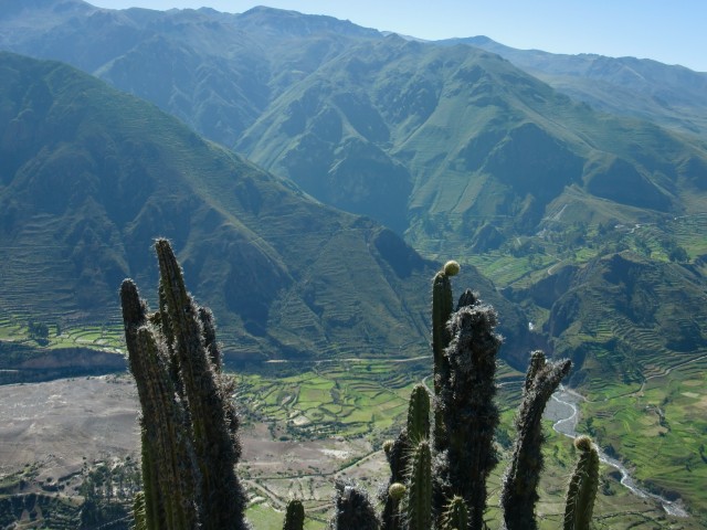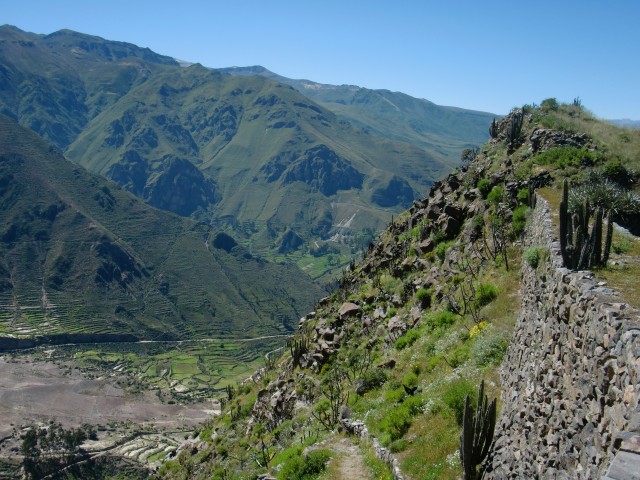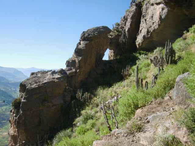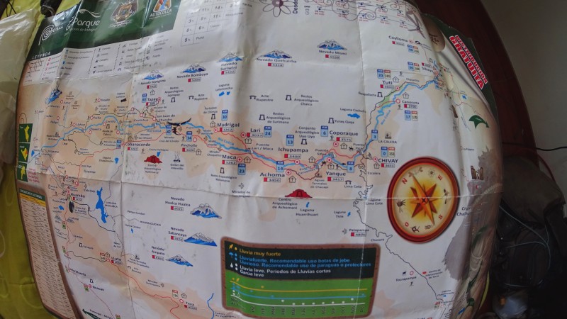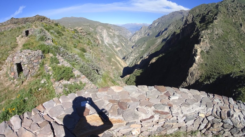 コンドルが見えるかもしれない要塞 Fortaleza Chimpa 攻略編 13、ペルー 2017年04月25日 前回の投稿にて攻略に失敗したMadrigal(マドリガル)にあるFortaleza Chimpa(フォルタレサチンパ)ですが、馴染みのカフェでそのことを愚痴っていたところ、昔行ったことがあるというオーナーのフレディさんがバイクで入口まで連れて行ってくれるという話になりました。でね、また行ってきましたよ。結果を先に言うと、ちゃんと登頂できたんですけど、今回もこれまた悔しい結果に終わってしまいました。行かなきゃよかったんじゃないかってくらいにもうホント。なにがそんなに悔しかったのか。ちょっと長くなりますが、まあ聞いてやってください。 ↑クリックで少し拡大可。コンパスの左上に現在地Chivay(チバイ)、中央あたりにマドリガル、そのちょい左に見える黒いコンドルの絵のところがCruz del condor(クルースデルコンドル、コンドルの谷)朝5時に待ち合わせ。外は非常に寒く、しかもバイク移動なので頭に首に手にと着こまなくてはなりません。エンジンを温めて出発。外は暗いながらも、顔を横に向けるとはっきりとした山の輪郭や谷の影が流れていきます。空は次第に明るくなり、山の向こうから一本の太陽光線が、ミルク色・紫・オレンジ・薄い水色に濃い空色とグラデーションを作りながら天上へ向かって射しています。・・・実を言うと、これが一番きれいでしたし、楽しかったです。このバイク移動のときが。マドリガルに到着したころには2人とも凍えてしまっていました。とくに膝が冷たくなって、脚がガクガクと大きく震えます。まだ6時30分で食事ができなかったので、コーヒーだけ注文。ホテルからもらってきたパン一つを半分、運転手フレディさんに分けてあげました。コーヒーはフレディさんがおごってくれ、それからもう一度バイクにまたがりフォルタレサの入口へと進み出ます。前回とは全く違う道へ・・・・・下に地図を用意しました。赤い線が前に行った道。ここからでも行けはしますが、かなり険しい道だったようです。前に写真を載せた川のなかを渡るか、崖の上から降りてこないといけないという意味なく危険が伴う道でした。今回は広場の横を通り、途中軽い十字路っぽいところを右方面へ抜けて砂利道をずっとずっと進む道。川があるところまでバイクで送ってくれたフレディさんとはここでお別れ。ちょうど同じタイミングで他の観光客3人も車でやってきました。うわ。マジか。自分一人しかいないと思ってたのに。このあたりでテンションは下がり始めています。 ↑川のところにある看板が目印空はだいぶ明るくなってきていますが、それでも寒い。どのくらい寒いかというと、 ↑朝露が凍ってしまうくらい寒いのです!2つ目の川の場所。上の手書き地図参照。 休む場所があったり駐車場があったり。ここでキャンプもできそうです。 こんな細い橋を渡ったら、ここから登山が始まります。 ↑寒いのにサボテンだらけ。影になってますが右下にもウチワサボテンがあります高所なのでちょっと登るだけで息が切れます。動画用にしゃべりながらカメラを向けて歩いていたので、さらに苦しいです。 ↑15分くらい登るとこんな景色椅子やゴミ箱など休憩場所が各所たくさん設置されている模様。 道が時々わかれていますが、毎度看板が設置されています。これで迷わないね!(下にも付けておけよ!) 遺跡のようなものも。 かまどとツボが置かれています。 昔の人がここに住んでいたのでしょうか。説明などはありませんでした。柵もないので、いつか誰かに壊されそう・・・そろそろ太陽が昇ってきて暑くなってきました。ここは非常に光が強いです。日焼け止めクリームとサングラスを持ってきた方がよかったと後悔しましたが、時すでに遅し。まあ天気がよくてよかったということにしておきましょう。汗をかくと体が冷えて大変なので、防寒のために着ていたレインジャケットなどを脱いで体温調整します。なにかちょっとカッコいい岩の隙間を発見。 道を外れて近づいてみます。 そこからの眺めは、 おおー。晴れているおかげでよりきれいに見えますね。まだ太陽が昇り切っていないので、影ができてまだはっきりとは写らないです。そうして写真や動画を撮りながら登り始めて約2時間、ようやく頂上へ。 ↑眩しすぎるせいで少し白っぽくなってしまってます何やら城壁のようなものがあります。まったく事前情報なしで来たのですが、フォルタレサというのは「要塞」という意味だそうです。今調べました。攻めてきたスペイン人が建てたものでしょうか。 1年ほど前に大きな地震があってこの辺は通行止めになっていたと聞きましたが、それでも崩れずに残っているというのはすごいことです。だってこれ、石積んだだけでしょ? 向こう側にある見晴らし場へ行くため、中をくぐります。すると、すごく小さな狭い階段がありました。 わーすごーい、RPGみたーい。気になるのでちょっと上