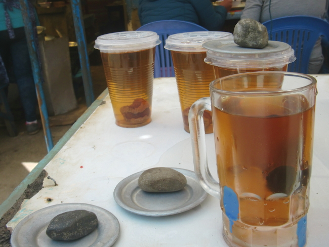 道路はところどころ穴が空いていて、そこに石を敷き詰めて修繕してある。