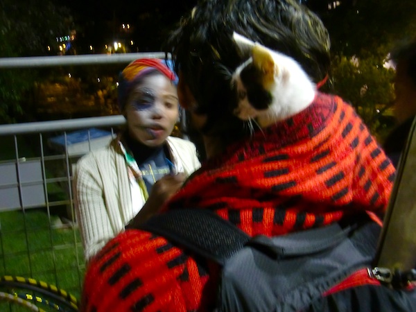 ネコを背中に乗せている彼はジャグリングをして稼いでいるようだ。