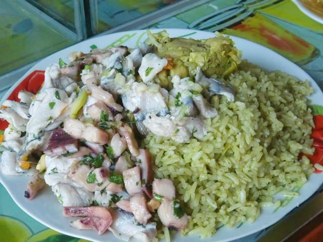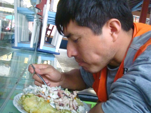 ATMがないので探しに行こうとしたら同行者を伴った話 Mollendo 13、ペルー 2016年10月12日 首を痛め、マタラーニというところで休んでいる。徐々にではあるが痛みは引き、首の可動域も広がってきた。薬局で買った薬が効いたのかもしれない。それにしても、お金がない。このへんは食堂の値段が高く、8ソル(280円)でも平均かちょっと安いくらい。今まで6ソル(210円)の世界で過ごしていたので、非常に高く見える。1日の食事回数を減らして節約してはいるが、それでも財布の中身は溶けてゆく。そろそろATMからお金をおろさないといけないが、この村の銀行に行ってもATMはなく、受付でも無理だと拒否されてしまった。しかし、親切に隣町にはあるという説明をしてくれた。しかも幸運なことに、銀行にいた作業員がそっちに用事があるというので、一緒について行ってくれることになった。止まっているタクシーに乗り込む。さっきの話では車で15分くらいかかると言っていたので、タクシーだったら20ソル(700円)くらいするかもしれないと構えていた。でもこのタクシー、乗り合いである。なんと3ソル(105円)で隣町Mollendo(モジェンド)へと運んでくれるのだそうだ。それなら安い!しかも作業員が払ってくれた。ちなみに乗り合いバンだと2ソル(70円)で移動できる。モジェンドに着き、作業員の男性と一緒に銀行へ。無事お金をおろすことができた。「俺は銀行でちょっとだけ仕事があるから、もし30分後ここに戻ってきてくれるんだったら帰りの車にも案内できるよ」それはありがたい。ぜひそうしてくれ、とOKサインを出した。暇なので町を回ってみる。結構大きな町なようで、人も結構多い。 ↑海に近い広場店やホテルがたくさん並んでいる。ああ、こっちに泊まりたかった。移ってこようかな。と考えたが、モジェンドとマタラーニ間は微妙に距離があり、その間の道は崖でトラックも多い。首も痛いし、できれば走るのは遠慮したい。 ↑なんか”さびれたディズニーシー”って感じの雰囲気↓ ↑この青い電車は観光電車だろうか ↑建物の感じは好き。中はどうなってるんだろう ↑町の中心部小さなスーパーで買い物をしたら30分を過ぎてしまった。銀行へ戻ってくる。「もう少し待ってたら来るから」そう教えてくれた銀行の警備員さんと少し話をしていたら、やあと手を挙げた作業員がニコニコと戻ってきた。ちゃんと時間を守るペルー人は珍しいと思う。腹が減ったので安い食堂を探すことに。しかしこの町も物価が高く、作業員が交渉してくれたが、それでもどこも9ソル(315円)オーバー。作業員のほうは、値段はいくらでも気にしないと言うので、「じゃあ待ってるから一人で食べて」と伝える。自分は食べなくていいや。作業員が12ソル(420円)する料理をメルカド(市場)で頼んだので、隣で座って待つ。「俺は値段より量が重要なんだ。この仕事は収入がいいからね。だから店の人がこの作業服を見たら値段を釣り上げたりとか、値下げに応じてくれなかったりするんだよね」なんて話をしていると、はい! と出てきた2人用の皿。食堂のおばちゃんが間違えて2人分用意してしまったようだ。注文と違うのでこちら2人は戸惑ったが、「いやいいよ、これで問題ない」彼が払ってくれるというのだ。ここに来るときのタクシー代も出してもらったのに、なんか申し訳ない。 ↑タコや白身魚のセビーチェ(酢の物)とアロスコンポジョ(緑のご飯に鶏肉が乗ったチャーハン)の山盛り ↑ガンガン食ってる食べるの早いね、と言うと、「ペルー人はみんな早食いで大食いなんだよ。だから病院はいつも満員なんだ。ははは」楽しそうに話しているが、冗談なのか本当なのか区別がつかない。ほかにも、「となりの国のエクアドルとペルーは仲がよくなくて、ペルー人はエクアドル人のことをmono(猿)と呼んでいるんだよ」※たしかにエクアドル人はみんなちょっと田舎っぽい顔立ちだった。「じゃあコロンビアは?」「コロンビアもそうだよ。カフェ~(長くて忘れた)って呼ぶんだ。ははは」というような地元ネタを聞かせてくれた。おごってもらってばかりだと悪いので、こちらもなにかおごってあげたい。「ハンバーガーがいい」というのでそれを買ってあげた。嬉しそうにしてくれていたが、本当は腹がいっぱいだったのではないか。ちゃんと喜んでくれたか定かではない。乗り合いタクシーに乗り、お別れした。そういえば名前も聞かなかった。彼はアレキパに住んでいるらしく、仕事で毎日いろいろな町に顔を出すのだそうだ。そんなだから、きっともう会えないんだろうな。久しぶりに大きめの街を見て回ったり、彼のおかげもあって、なかなか楽しい小旅行となった。そしてもうひとつ、言っておかなければならない。モジェンドのメルカド近くの角にアイスクリームやシャーベットが売っているカフェがあるのだが、そこの10ソルのフラペチーノがおいしかったことを。その店でフラペチーノの出来上がりを待っていると、みんな
