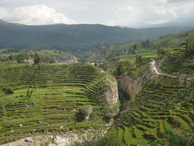 遺跡と温泉にいこう Chivay ― Colcaその2 13、ペルー 2017年04月13日 せっかくコルカ谷に来たのだから、谷のほうも観光しようではないか。ということで、ホテルの人がくれた情報に沿って、近場の遺跡とその近くにある温泉に行ってみることにしました。荷物を降ろしたいつもより軽い自転車に乗って、いざ出発。今回は町の裏から出る道を行ってみることに。途中でアスファルトが切れてしまっているらしいけど、このオンボロ自転車で大丈夫でしょうか。橋を渡り、高そうなホテルやプラネタリウムの横を通りすぎて空を向く坂をゆきます。丘を登り切ったところの景色は、 ・・・めちゃくちゃきれいじゃないですか?ここから下り坂。下へ下へ。自転車だから爽快です。 段々畑に黄色い花畑。人の手が加えられてなお美しい自然が、身の回りに流れていきます。地面が石だらけになり悪路になってきたころ、一つお隣の村であるCoporaque(コポラケ)に着きました。 ↑黒猫が門の上で見張りをしている。見えるかな? 村の食堂で昼食をとり、店で飲み物を買いながら、この近くにあるはずの遺跡の情報を聞き出します。広場に入ってきた道を左手側に曲がって道なりに行けばいいという話。距離としてはそんなに遠くはないということです。ちょっと天気が崩れてきているのが気になるので、急ぎましょう。と言いつつ、景色がきれいすぎて写真とムービーを撮りまくる自分。おかげでここまでずいぶんと時間がかかってしまっています。10kmを3時間※くらいかけ、走っては止まって写真を撮ってを繰り返していました。※通常、平地なら自転車で1時間12km進む。 ↑草原に羊と石垣。奥に見える村はYanque(ヤンケ) ↑この段々はすべて自然のものなのだろうか。それとも誰かが作ったのかな。人が作ったにしては細かい階段状のところも多いけど ↑左は晴れ。右奥は雨が降っているのが目でわかる ↑雨のカーテン ↑中央ちょい右に赤い橋がかかっている。これ渡るの怖そうだなうーん・・・やはり写真では実際に見たものには遠く及ばないですね。これは画像サイズを小さくしているので画質の劣化も大いに関係あるのですが、やはり目で見た立体感と質感、色合いが全然違います。ブログで伝えるのってやっぱり難しいですね。でももしネットで全部体験できてわかっちゃったら、それはそれで味気ない気がします。気になった方がいたら、やはり自分で行って自分の目で確かめるべきかもしれませんね。そして、ついに完全にガッタガタに変貌した道を進みます。地図に記載されている通り。そんな大自然のなか、明らかに不自然な看板が立っているのが見えました。 ここがUyo Uyo遺跡です。もっと目立たない地味なところだと思っていましたが、入口には小さな駅のような建物が建っていました。そこで名前などを記入。そして中へ入ります。自転車はここで待っていてもらいましょう。登山道のような登りが5分ほどつづき、途中2か所ほど展望台がありました。しかしそれどころではない!天気が悪くなってるし、プラスこの後温泉に行かなくてはいけないのです。急げー!!山を登り、ようやくそれっぽいところに到着。全然遺跡の姿が見えなくて、実際このウヨウヨ遺跡がどんなものなのかも知らない自分は、「まさかこのまま何もないとか・・・」そんな予感が頭のなかのサーキットをギュンギュン回っているところでした。一安心。 ↑朽ちた石の何かが見え始めたころ ↑ほら、ウヨウヨしてきたしかし、なんだかちょっと変です。だってこの石壁、石の隙間に詰まっているつなぎが明らかに高水準ですよね。さっき見た看板には紀元前500年ごろの村だって書いてあったのに。あれれー、おかしいぞー?奥へ入っていくと、それとなく見どころっぽい遺跡がありました。そして「スタッフ」とかかれたジャケットを着た人がひとりポツンと座っています。 その公式ガイドのおじさんはとても嬉しそうにこちらへ近づき、こちらの手に持つアクションカムを見てその小ささに驚いて見せました。彼はこの遺跡について「ちょっと説明してもいいかな」と途切れのないスペイン語で聞いてきました。とても話したそうです。大体くみ取れた部分を書き出すと、ここは紀元前の村であり、あるときスペイン人の侵略により潰れてしまったそうで、それからは崖の向こうのヤンケに移り住んだということです。つまりここが前ヤンケであり、今のヤンケ村は新ウヨウヨということになります。上の写真にある窓が並ぶ建物は豊作を祈る場所だったようで、窓ひとつにつきトウモロコシ・じゃがいもなどの作物ひとつの豊穣を祈祷する場所だったようです。毎日一か所づつずらしてお祈りしていたそうです。それってどうやってわかったんだろう。その反対側にある大きな建物。 ↓こちらここは太陽の神が祭られた神殿のようなところだそうです。ここだけは建物がしっかりと残っていました。壁もセメントではなくちゃんと粘土で作られていまし