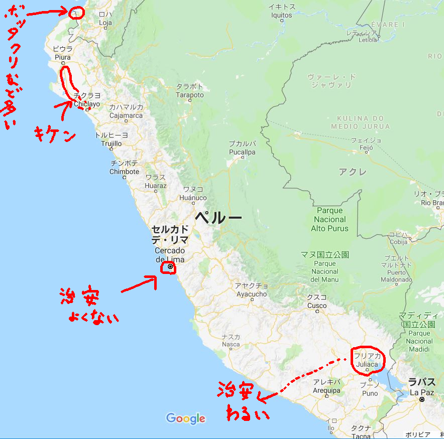 ペルー情報まとめました。2018年版 13、ペルー 2018年09月01日 ペルーをじっくり自転車で旅行してみて、わかったことをまとめてみました。参考にどうぞ。※これを書いているのは2018年ですが、北部・中部はもっと前の情報になるので、もしかしたら状況が変わっていることもあるかもしれません。言語公用語はスペイン語、ケチュア語、アイマーラ語。広く話されているのはスペイン語。アンデス山脈のあたり(シエラ地帯)ではケチュア語を話す人が多い。チチカカ湖周辺ではアイマーラ語が使われる。ジャングルのほう(セルバ地帯)はシピーボ語を話す人たちがいる。他にもいくつか独自の言語が存在。貨幣ヌエボソル(nuevo sol)。通称ソル。1ソル=大体33円。(2018/8現在)スペイン語で「ヌエボ」は新しい、「ソル」は太陽という意味。banco de la nacion(バンコ・デ・ラ・ナスィオン)という銀行の multi red(ムルティレッド)という ATM(スペイン語では cajero カヘーロ)は ATM 手数料が無料。ただし1回につき400ソルまでしかおろせず、使用可能回数は1日2回まで。アメリカドルはおろせない。そのうち有料になる可能性もあるので注意。物価意外にも、海沿いのコスタ地帯より山のシエラ地帯のほうが物価は安いことが多い。ほかの国では大体逆なので(暑い海岸沿いは物価が安く、寒い山の中では物流も難しく物が高いことが多い)、これは珍しいのではないだろうか。おそらく海沿いにリゾート地が多いこと、山の中でも農業が盛んであることが関係していると思われる。違ったらごめん。一番物価の安い地域は、プーノとその周辺。天候大体11月ごろから3月いっぱいまでが雨期。それ以外が乾季。【雨期】はほとんど曇りで、昼すぎから雨が降り出すことが多い。【乾期】は雨がそれほど降らないが、まれに大雨が降ることもある。乾燥していて肌がすぐ荒れるので注意。晴れが多いので紫外線量にも気をつけなくてはならない。風が強い。海沿いのコスタは砂漠が広がっているため、基本いつでも暑い。高地のシエラは標高2500m以上になるので乾季でも夜は寒く、雨期に雨が降るとなおさら寒いし一度濡れると乾かなくて地獄。しかし虫が少なくて助かる。セルバは多分いつでも暑い。ジメジメしている。汗をかいているのがわかりにくいので熱中症に注意。治安 特に北の海沿いの治安が悪く、ピウラ~トルヒージョ間は強盗のアルバイトなんかもあるそうだ。首都のリマも地域によってはかなり酷い。日本人宿で強盗・スリ・置き引き・ひったくりを受けたとリアルタイムで聞いたし、実際に自分も被害にあった。山中は治安のいいところが多いが、南部のフリアカはスリが多いようだ。アレキパも、悪くはないがスリがそこそこ存在する。クスコは行ってないのでわからないが、それほど悪くないらしい。※実体験・旅行者の話・現地民の話を総合した情報です。インターネットペルーは南米のなかではわりと広くネットが普及している国だと思う。Dota2 などのネットゲームが流行っているのもその理由のひとつだろう。多くの宿で wi-fi が使え、別途料金を取られることも少ない。山奥に行くほど wi-fi は手に入りづらくなるが、ネット屋ならけっこうよく見かける。1時間1ソル(33円)前後。ペルーの人々大まかにわけて、【感じのいい人】【感じの悪い人】【悪い人】の3つ。もちろん完全にわかれるわけじゃないが、印象としてはこんな感じだった。海沿いは【感じの悪い人】が多く、南部は全体的に【感じのいい人】が多い印象【悪い人】は「治安」の項を参照。働き者でほとんど休みを取らずに毎日働いているが、根は真面目というわけではなく楽観的。お金がないといいつつ毎日気楽に暮らしている。ただ人に苦労を見せないだけだったのかもしれないけど。全員ではないが多くの人は計算が得意。暗算が早く、店のおつりも間違える人は多くなかった。行動力があり、アイディアをすぐに実行する印象がある。約束事をすっぽかす文化があるので注意。待ち合わせをしても来ないことが多い。国境エクアドル ― ペルー海沿いの Huaquillas(ウアキージャス)はぼったくりが多いので注意。治安もよくない。町とイミグレーションが数km 離れているので少しめんどくさい。山のほうでは2つ道があり、自分が行った Macara(マカラ)は落ち着いていてイミグレの人たちも優しかった。町から少し進んだところにポンポンと2つ出国、入国用の小さなイミグレーションオフィス小屋がある。ペルー ― ボリビア(チチカカ湖)噂によると Desaguadero(デサグアデーロ)のイミグレの評判はすこぶる悪いらしいので行かなかった。そうでもなかったと言う人もいるので、今はどうなんでしょう。Yunguyo(ユングーヨ)- Copacabana(コパカバーナ)はすんなり通ることができるはず。審査官も親切だった。滞在超過のペナルティ料金を払う場合は、一度ユングーヨの銀行まで払いに戻らないといけない。両替所の話はこちらから。音楽ペルーの伝統的な音楽で有名なのは cumbia クンビ